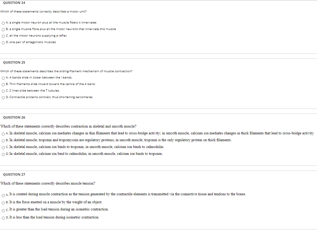 Which of the following statements is FALSE regarding skeletal muscle contraction. Which of the following statements about smooth muscle contraction is correct. In smooth muscle calcium ions bind to a regulatory protein on thick filaments.